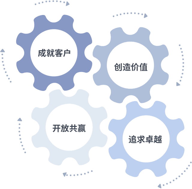 成就客户是一切决策的出发点,,创造价值是衡量所有工作的标准,,,,追求卓越是我们做事做人的态度,,,开放共赢是我们的格局也是最终的结果。。。价值观的齿轮环环相扣,,,,推动着组织里的每个人不断向前。。。。