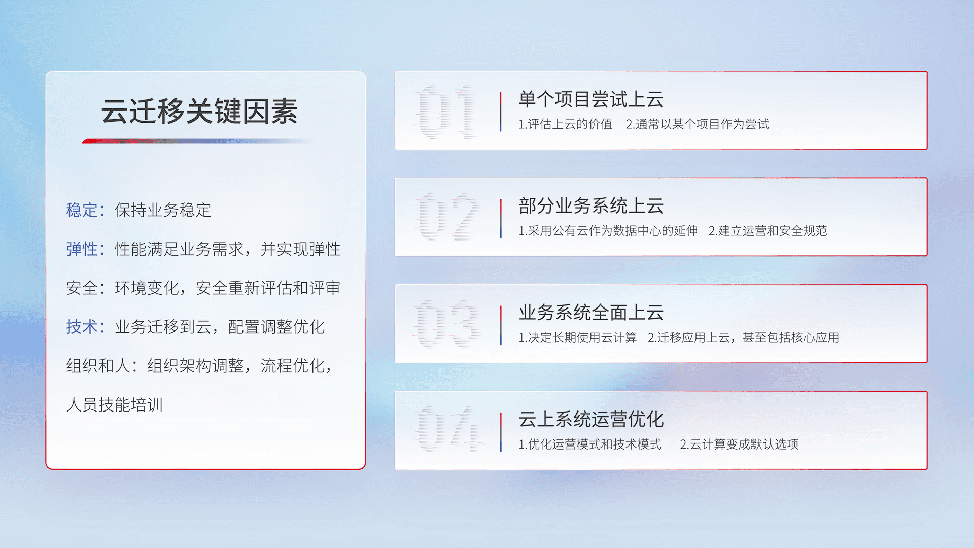 结合实际业务,,,,从规划设计、、云平台选型、、、云原生改造、、、、数据迁移、、、集成交付,,,迁移全过程为客户识别最佳上云路径,,,,做好风险识别管理,,设计网络架构、、身份权限、、、、安全审计合规、、操作审计、、、日志审计、、、监控告警策略、、、、多站点容灾设计等,,,,对云上基础设施进行整体规划,,提升IT治理水平,,,,以满足弹性、、、高可用、、、、高性能的需求。。。