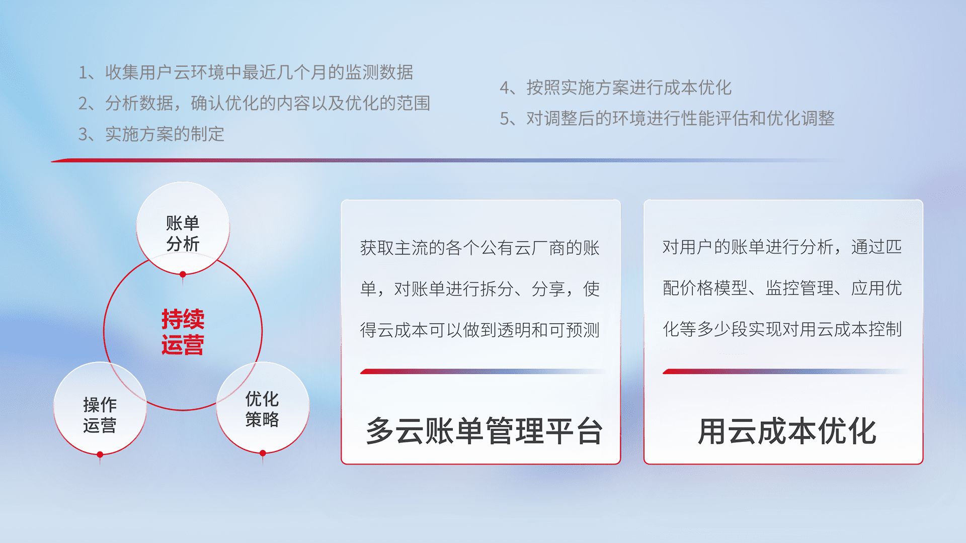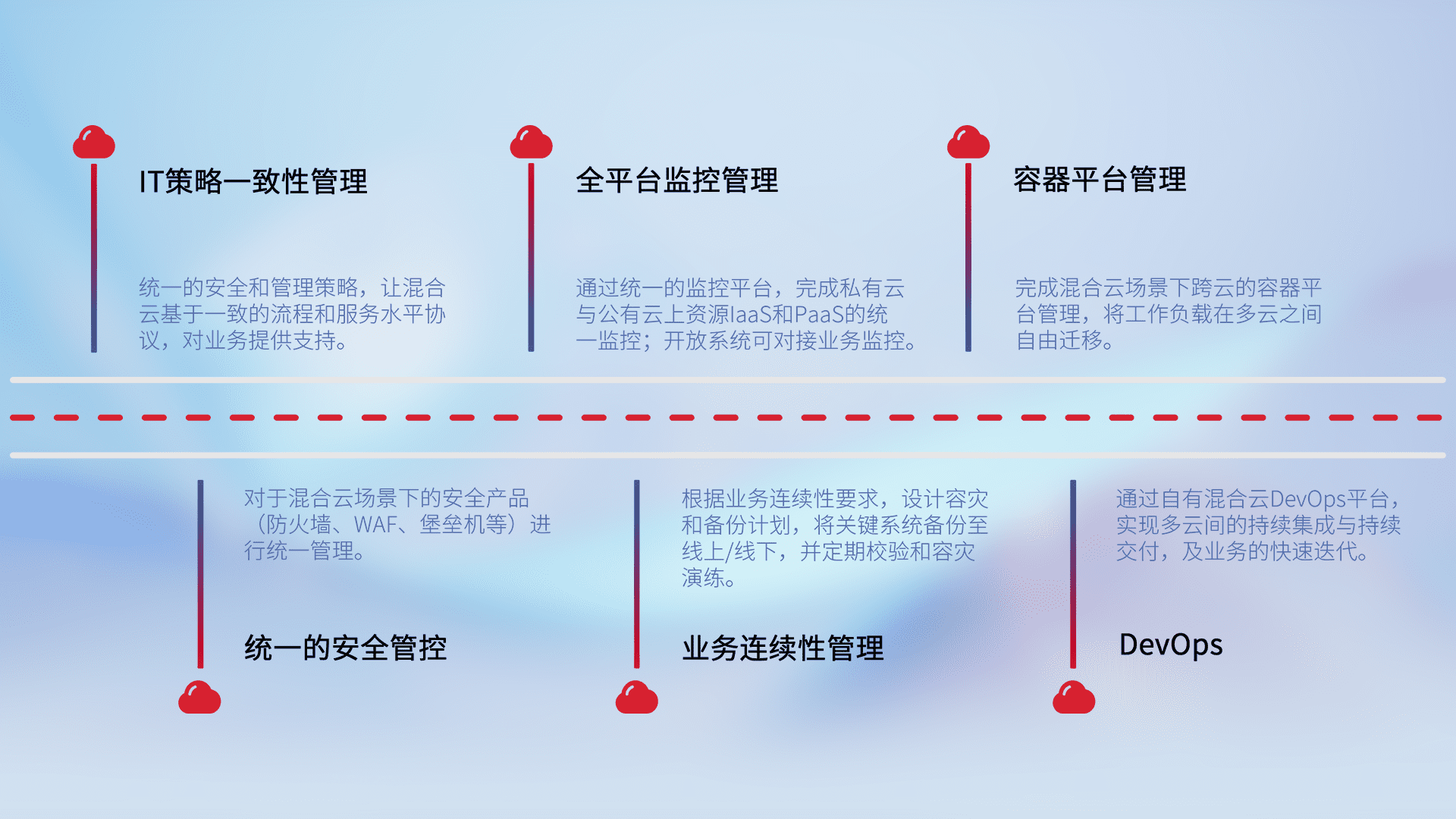 通过多云纳管,,,以统一的资源数据模型把客户的云资源进行抽象和封装,,,进而实现对多云资源的统一操作,,,,保障云资源管理的可靠性、、、、稳定性与可用性。。量身定制化运维内容,,,配置、、、开发运维、、、补丁管理、、备份、、、监控、、、、认证和访问管理、、、审计和日常巡检等,,,保障在用云过程中的可靠度,,,,稳定度以及高可用率。。。