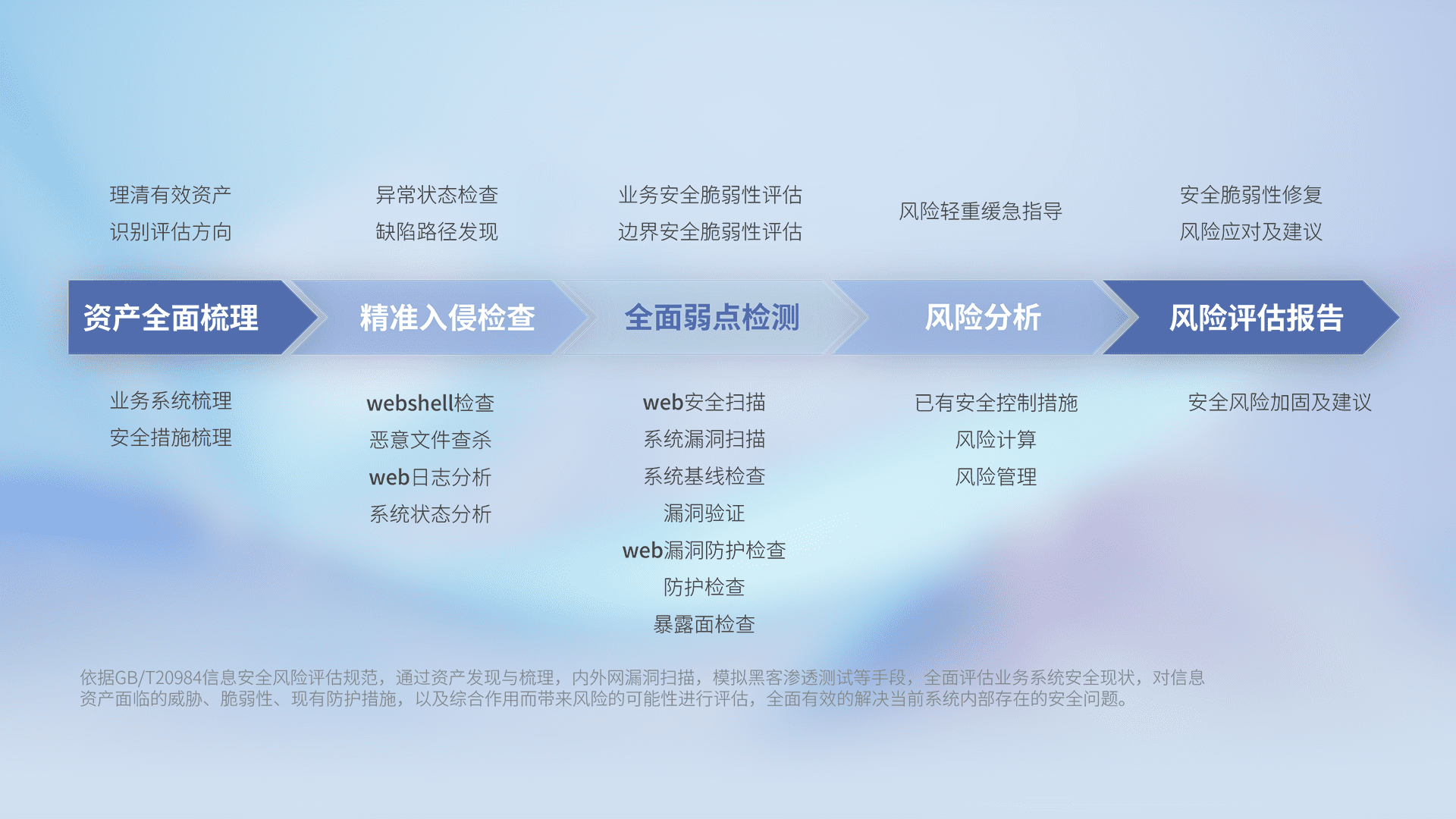 针对客户行业特性,,,以专业的安全服务+多厂商联合解决方案提供专属的一站式安全管理服务,,,,帮助客户全面感知网络空间威胁,,,,基于识别、、、、检测、、分析、、、、防护、、、、监测、、、、响应的服务理论模型,,,从方案咨询、、、集成交付、、、评估验证、、、、优化加固、、、、运维运营,,,致力于为客户提供完整的闭环管理式安全服务。。。以实战经验为客户打造高抵御风险的安全体系,,帮助客户发现威胁、、、对抗威胁、、处置威胁,,,,不断积累安全对抗能力,,,持续保障数字化安全。。。。